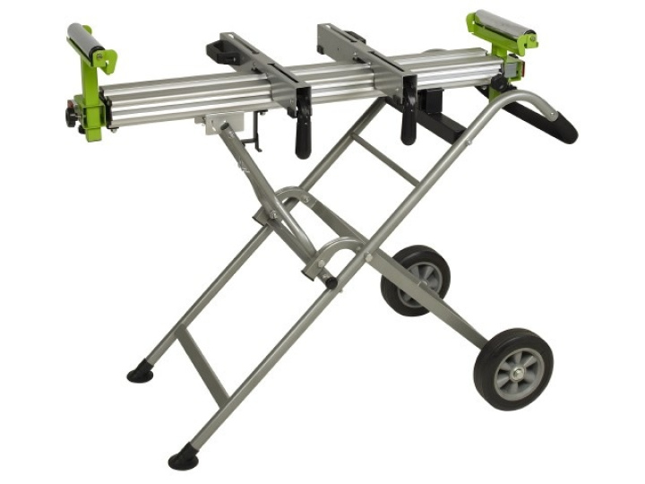 Sågbänk med två funktioner. Stadigt arbetsbord på hopfällbart stativ som enkelt kan vikas ihop till en praktisk transportvagn med stora hjul. Utrustad med integrerade stödben i förlängningsarmarna som kan dras ut och fällas ner för att ge extra stabilitet vid exempelvis tunga arbetsstycken. Ihopfällbar även med maskin monterad.